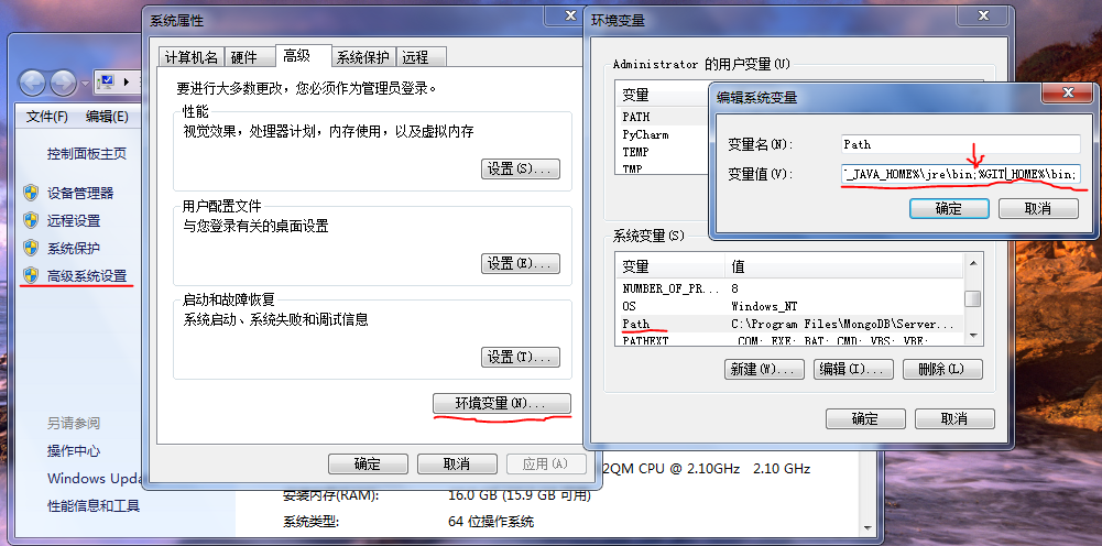 鼠标右键点击(我的电脑)-->高级系统设置-->环境变量-->系统变量-->变量名为Path