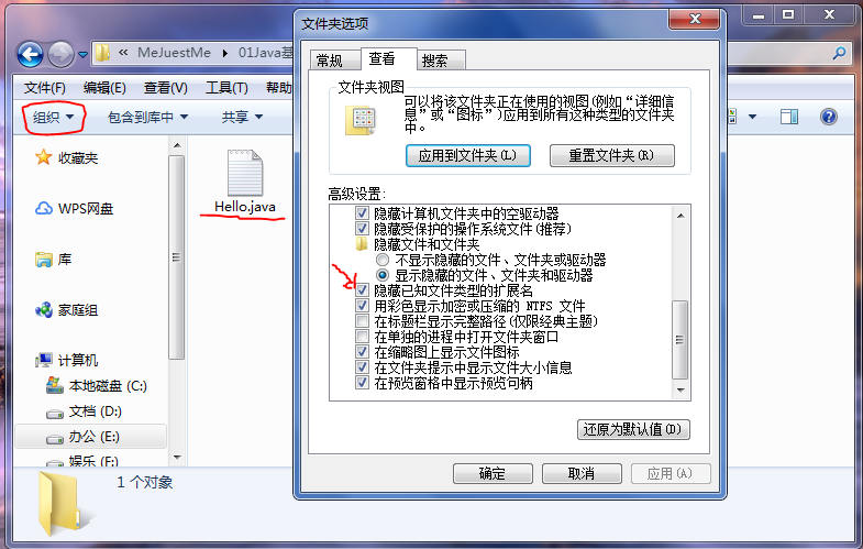 这是修改之前看到的Hello.java将隐藏已知文件夹类型和扩展名的钩去掉以后点击应用,会发现文件变成Hello.java.txt
