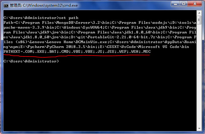 在Windows命令中有一个set命令,可以查看所有系统变量(类似K-V形式)通过help set命令,可以发现使用set path可以查看环境变量信息其中,PATHEXT表示支持的扩展名(后缀)