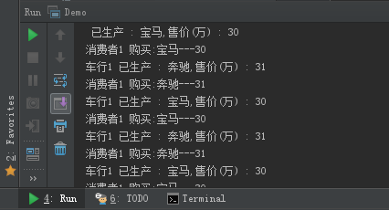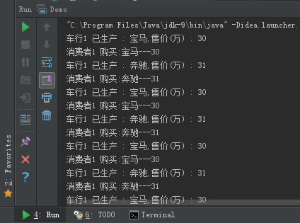 | public static void main(String[] args) { Car s = new Car(); Product product = new Product(s); Consumer consumer = new Consumer(s); Thread product1 = new Thread(product,"车行1"); Thread consumer1 = new Thread(consumer,"消费者1"); product1.start(); consumer1.start(); } class Car { private String name; private int money; public synchronized void set(String name,int money){ this.name = name; this.money = money; } public synchronized Object[] get(){ Object[] carInformation = {new StringBuilder().append(name).toString(),money}; return carInformation; } } class Product implements Runnable { private Car s; public Product() {} public Product(Car s) {this.s = s;} int x=0; @Override public void run() { while (true) { if (x % 2 == 0) { s.set("宝马",30); System.out.println(Thread.currentThread().getName()+" 已生产 : 宝马,售价(万) : 30"); } else { s.set("奔驰",31); System.out.println(Thread.currentThread().getName()+" 已生产 : 奔驰,售价(万) : 31"); } x++; try { Thread.sleep(100); } catch (InterruptedException e) { e.printStackTrace(); } } } } class Consumer implements Runnable { private Car s; public Consumer(){} public Consumer(Car s) {this.s = s;} @Override public void run() { while (true) { Object[] carInformation = s.get(); System.out.println(Thread.currentThread().getName()+" 购买:" +carInformation[0] + "---" + carInformation[1]); try { Thread.sleep(100); } catch (InterruptedException e) { e.printStackTrace(); } } } }