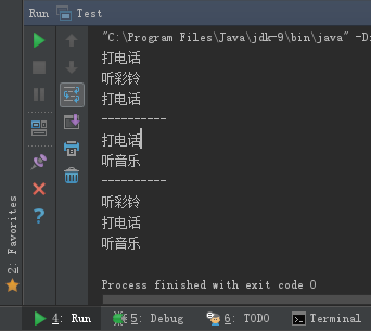 public static void main(String[] args) { Phone phone = new IPhone(); phone.call(); Phone singPhone = new SingPhoneDecorate(phone); singPhone.call(); System.out.println("----------"); Phone musicPhone = new MusicPhoneDecorate(phone); musicPhone.call(); System.out.println("----------"); Phone newPhone = new MusicPhoneDecorate(new SingPhoneDecorate(phone)); newPhone.call(); }